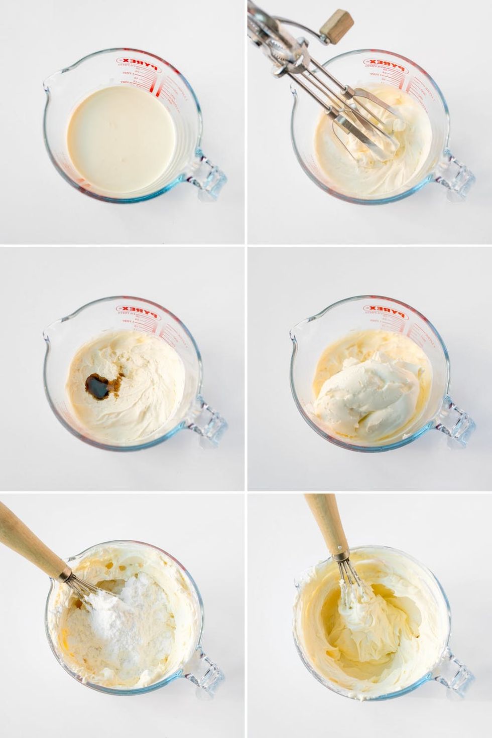 - Pour the whipping cream into a large bowl or jug and whisk until soft peaks form. Add in the vanilla extract, cream cheese, and confectioners’ sugar, then whisk again until smooth and creamy.