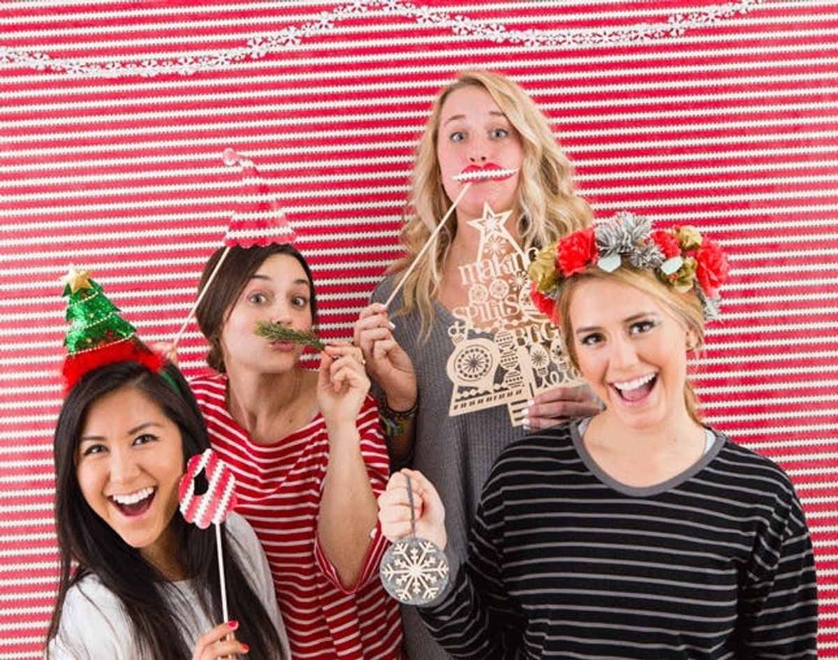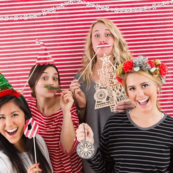 Did you go crazy buying wrapping paper this year like we did? Yeah? How could we help ourselves when there were so many amazing patterns and colors? Well, we’ve got a great way for you to use some of the leftover wrap that you love so much. We’re working with Hallmark to create a last-minute photo booth for your holiday shindig. Not only can you make a backdrop, but you can also make props out of your gift-wrapping goodies. We created a paper flower crown out of tissue paper and some ‘staches and hats out of wrapping paper, and we want to share our techniques with you! Have a look.