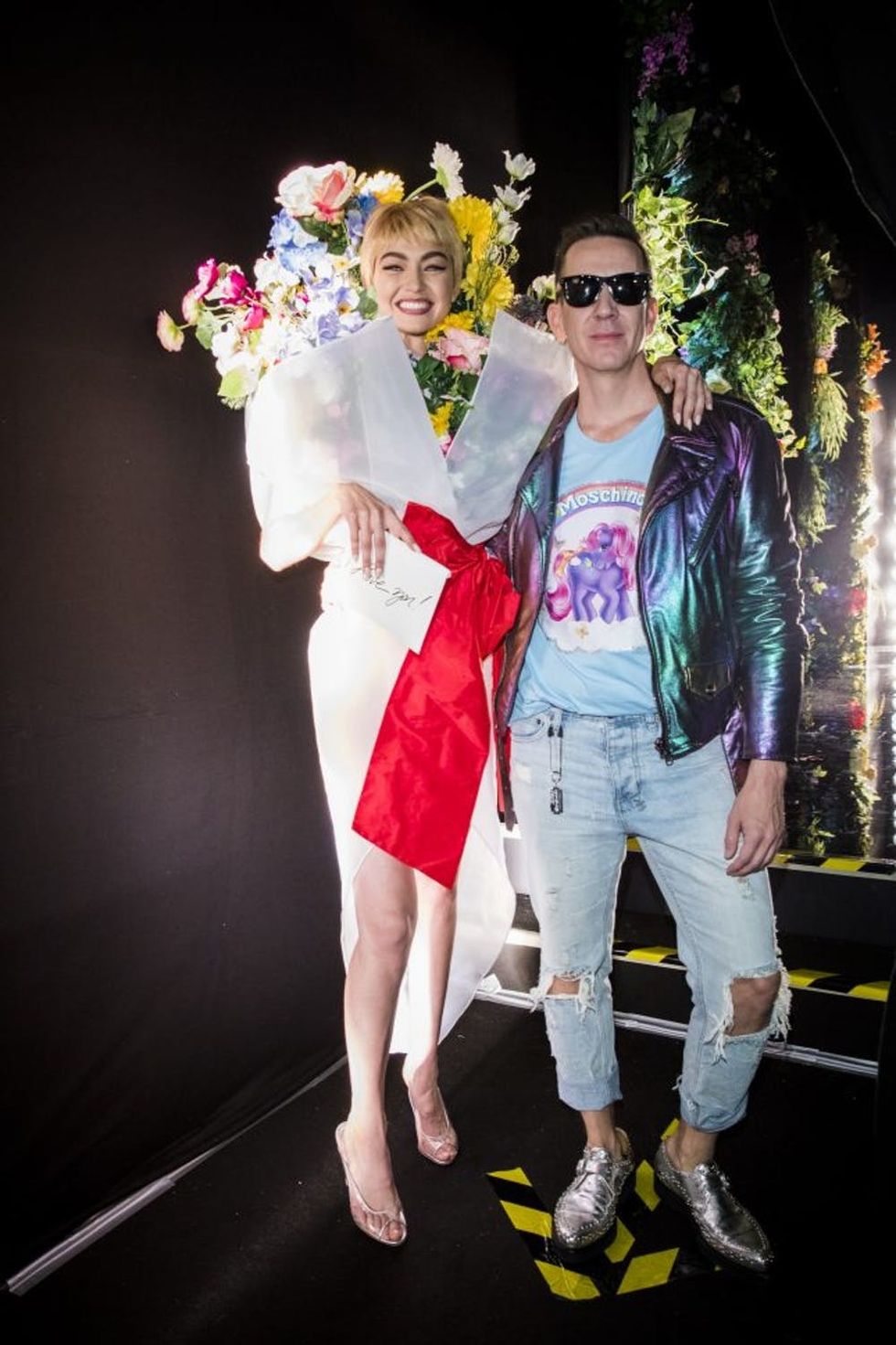 For the show’s big finale, designer Jeremy Scott showcased Hadid in a sheer ivory dress with a massive red bow, with an entire floral arrangement sticking out from the model’s body. To complete the human bouquet look, the 22-year-old rocked a short blonde pixie cut with full bangs, strong brows, and ’90s lip liner. It was definitely the wackiest look of Fashion Month so far.