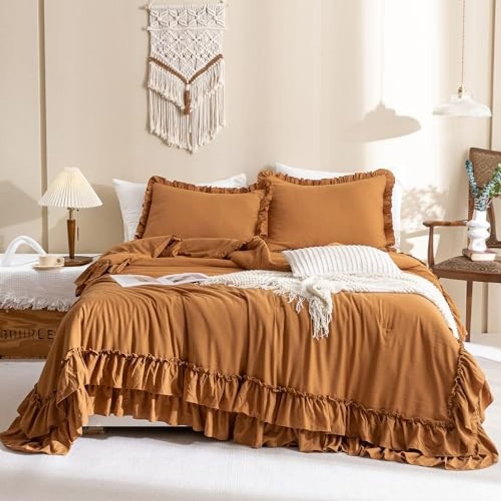 This cozy bedding set has the cutest ruffle design, and the color selections are perfect for creating a warm, inviting bedroom vibe. The set comes with a comforter and two shams, so it's easy to instantly elevate your bedding.