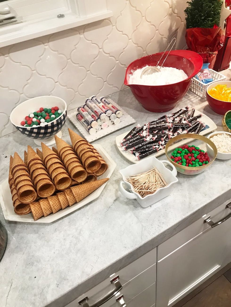 3. A Sturdy Base: Having a piece of cardboard or a baking sheet that each gingerbread house will be decorated on is key. It makes it easy to be moved once decorated and it gives more space to decorate, add a yard, or whatever! To keep it clean, give each guest an assigned workspace and cover it with brown kraft paper or a disposable plastic tablecloth. You could even create a festive tablecloth or table runner using wrapping paper.
