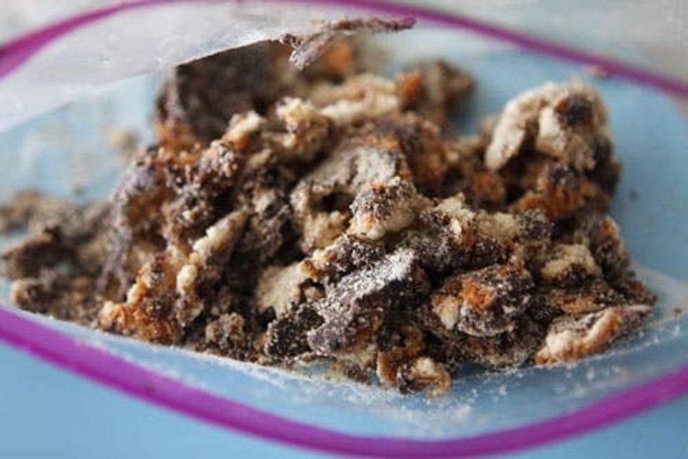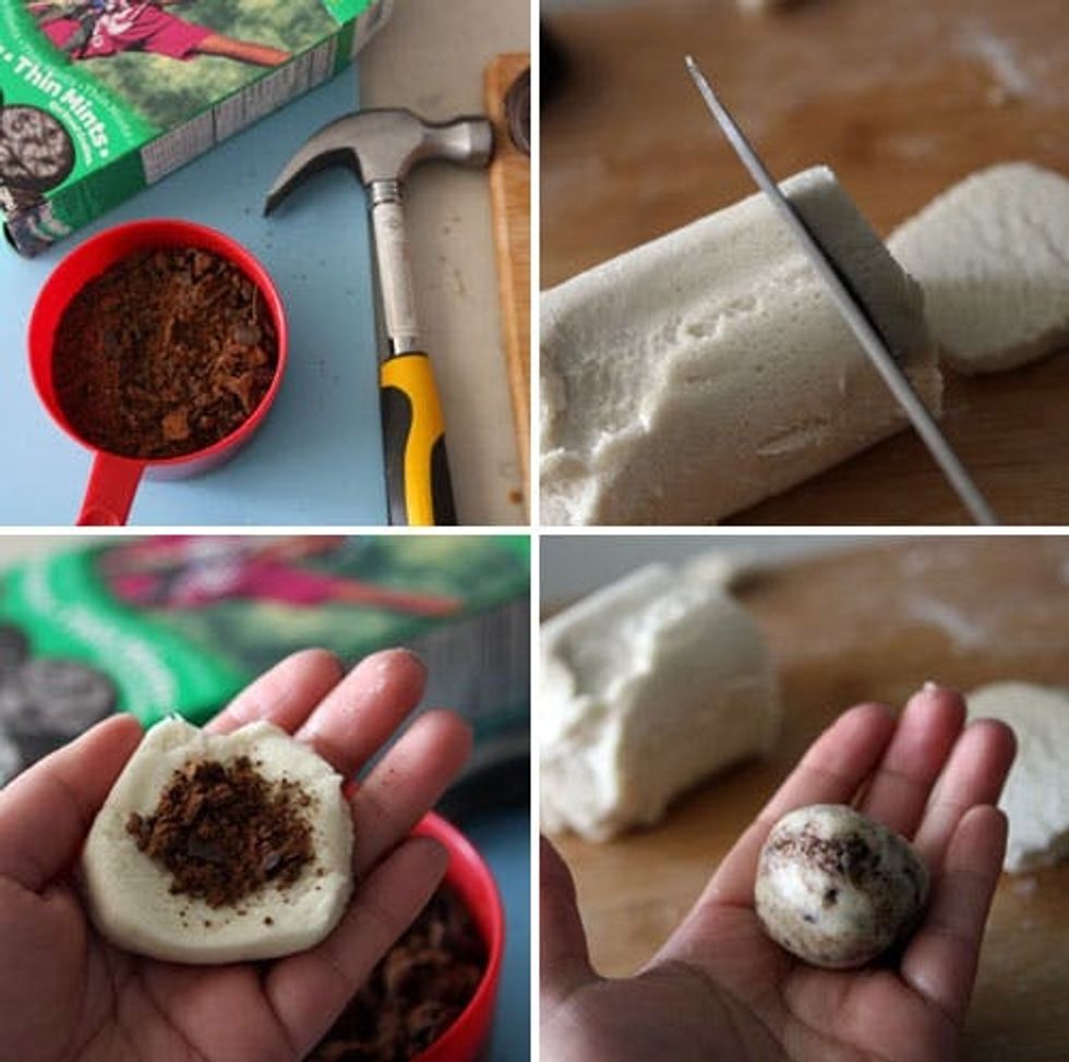 Preheat the oven to 350 degrees °F. The steps for each different cookie are more or less the same. Reserve 2 cookies for garnish at the end. Then take 5-6 cookies and place in a plastic bag. Hammer them until they’re good and crumbled, but not full-on cookie dust. We’ll begin with Thin Mints.