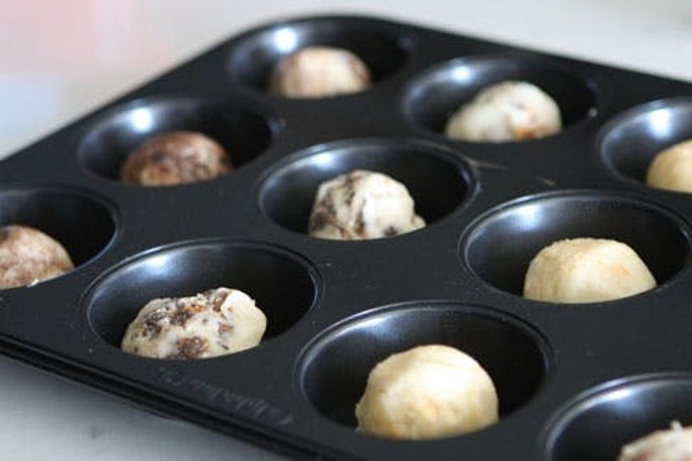 Roll your cookie crumbs into the sliced dough so you form a ball. Place the ball in a lightly oiled muffin pan.
