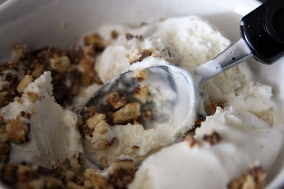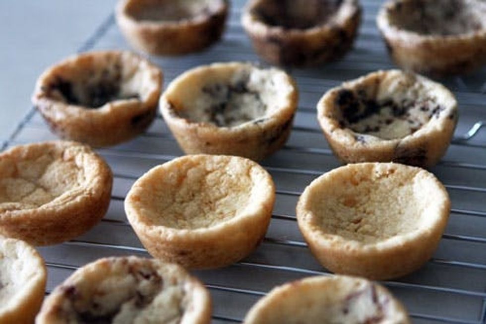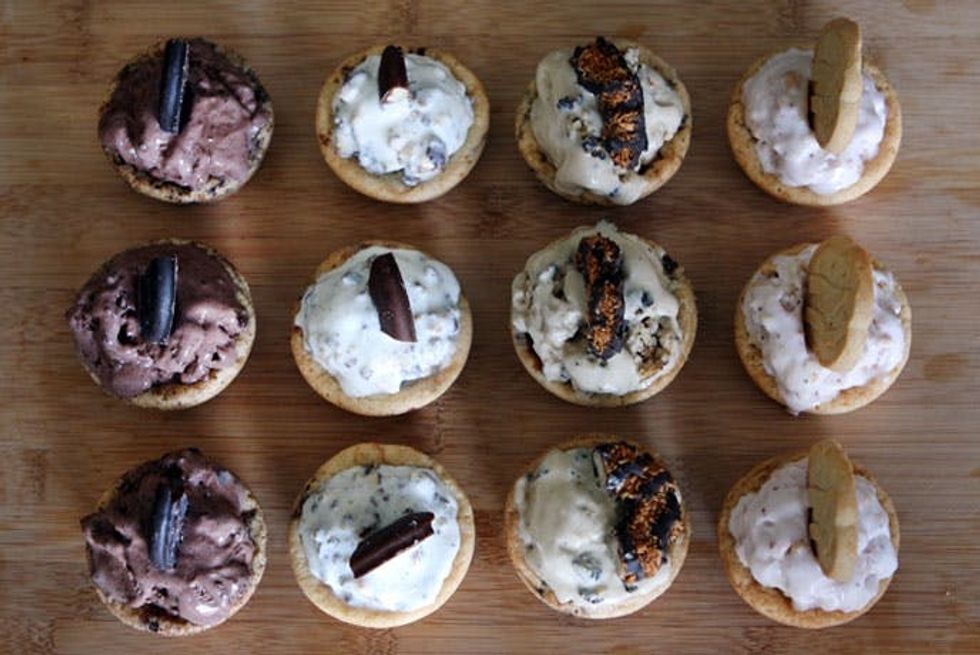 While the cups are cookin’, it’s time to prep the ice cream. Simply use an ice cream scoop to mash cookie crumbs into the ice cream, and place back in the freezer while cups continue to cook.