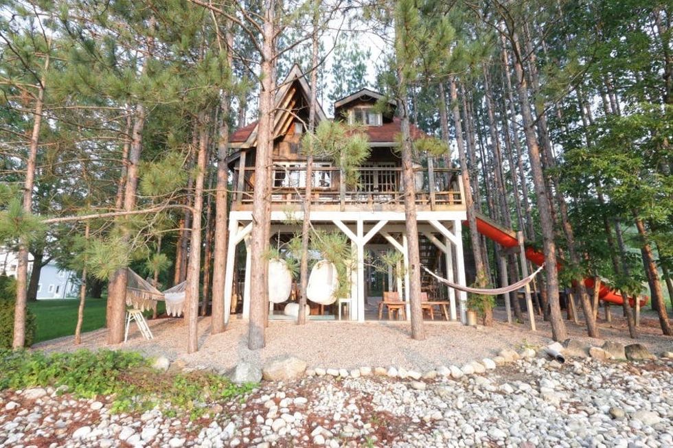 This adult-only treehouse is about two hours from Toronto and offers a luxurious boutique environment. The interior is decorated in an elegant style while the outdoor area is playful with hammock chairs on the porch and a slide. An outdoor pool completes this ultimate relaxation retreat. (Photo via Lynne Knowlton)