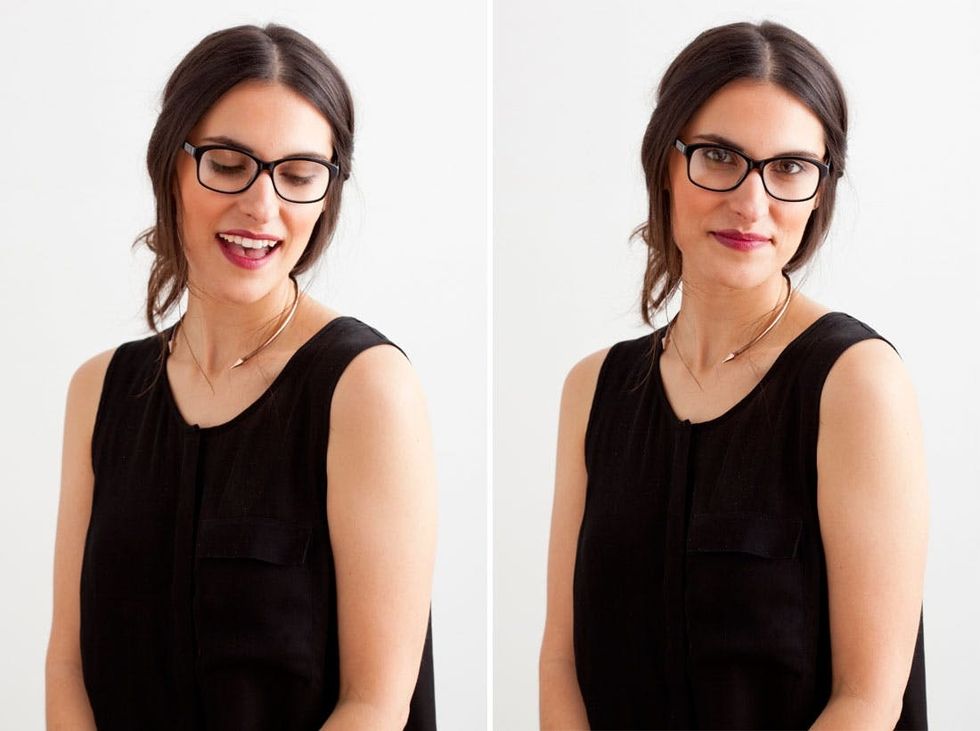 Distract from the lenses and play up that pucker! This look is all about pairing a nude eye with a bold lip shade. Of course, the best “nude eyes” do involve a little bit of makeup ;)