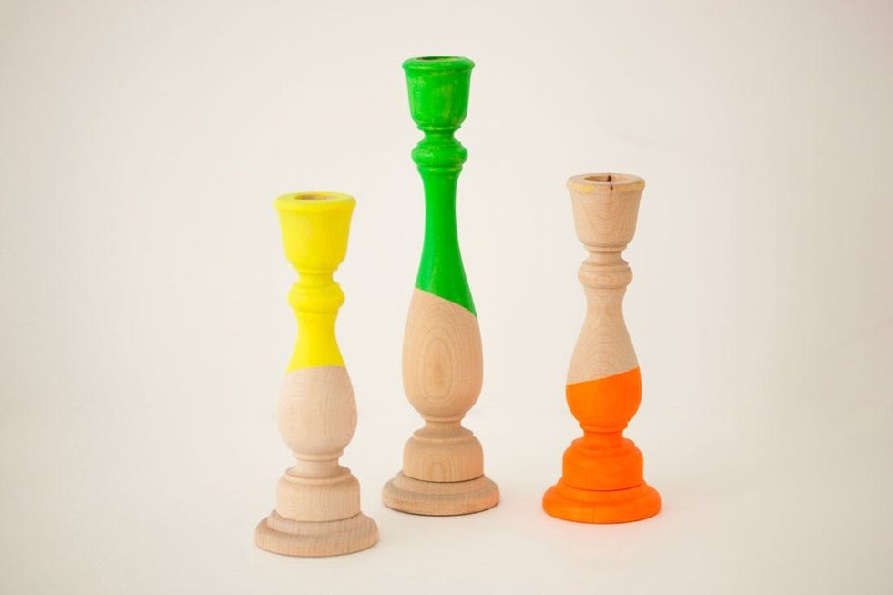 This time you’ll wrap your tape around wooden candle holders. The tape sticks strongly but give it a little extra rub to make sure that the paint doesn’t seep underneath.