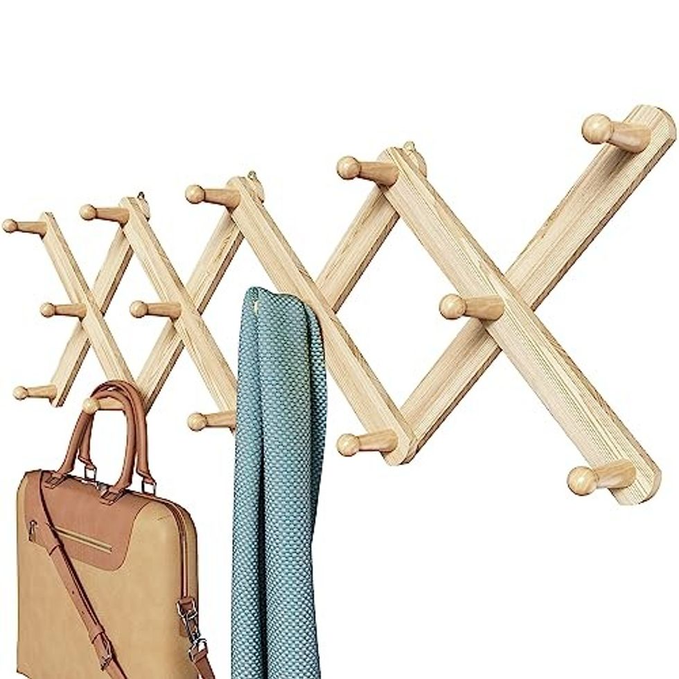 Hang hats, purses, and coats on this expandable wooden wall mount hanger. The neutral material keeps it from looking like an eye sore and can be expanded for more hanging space as needed.