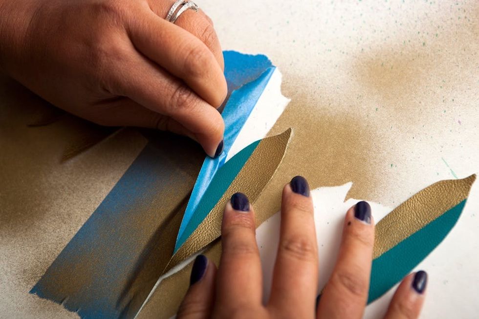 Now, it’s time to do the dip. First, use painter’s tape to mask off part of the leather. We attached all of our leather feathers to an old poster board. Make sure you cover every part you want to stay un-painted.
