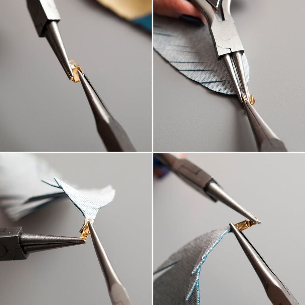 Next is the trickiest (but still pretty simple!) part. Open up a cord end and place the top of your first feather in it. Use your pliers to clasp the cord end around the feather. Press hard so it’s really in there. You can also add a dab of E-6000 glue if you’re worried about the feather coming loose.