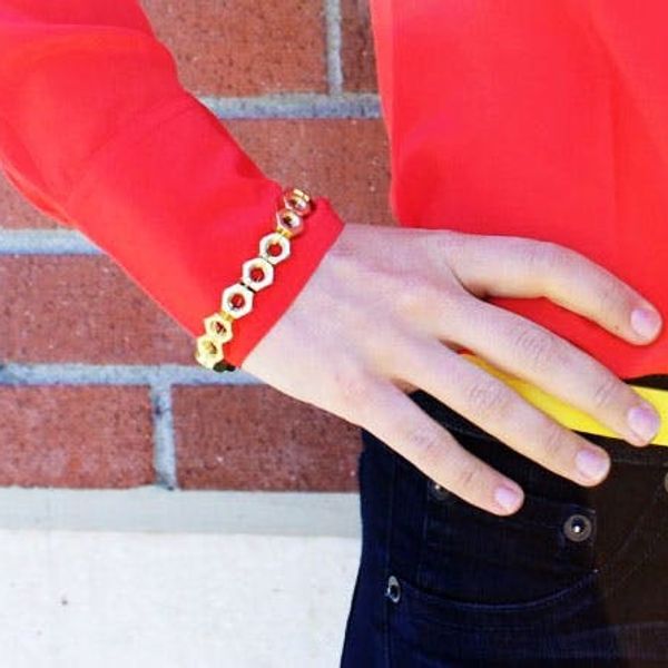When thinking about holiday style, we’re all about glitter and gold. We showed you how to glitter your oxfords, your heels, and your button downs, and now it’s time to go for the gold. For today’s holiday bling, our main star is a box of hex nuts from the hardware store. With just a few simple tools, we created a pair of gold studs, a bracelet, and a sweet statement necklace all using hex nuts!