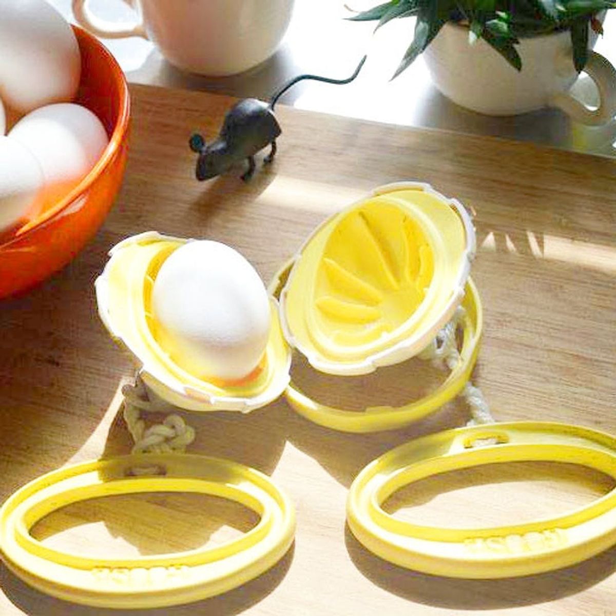 The gizmo relies on centrifugal force to scramble eggs without breaking the shell. To cook up eggs to scrambled perfection, all you have to do is plop an egg in the cradle, close and twist the ring until you hear a click and then swing and pull the handles until you hear the eggs scramble. The alternating rotation mixes the white and yolk inside the Goose, “laying” fresh and flavorful golden eggs with no whisks or whipping required!