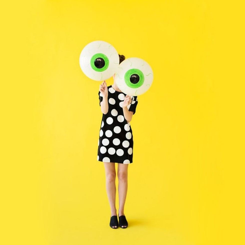 To create the eyeballs you will want to use white round balloons. Next, cut a medium-sized circle out of green tissue paper and then a smaller black circle out of construction paper. Use double-sided tape to attach these circles together and then to the balloon. Make these eyeballs even creepier by using a red marker to create veins around the eyeball. (Photo via Studio DIY)