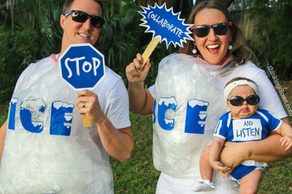 Alright, stop, collaborate and listen, Brit is back with a brand new invention — the Ice, Ice, Baby family costume! This idea is not only silly; it’s also super easy. All you need are clear trash bags and a blue Sharpie. Hand letter on the word ICE and then cut a hole for your waist and two holes on the side for your arms. Slide the bag over your shirt and stuff with more clear trash bags to resemble ice. Dress your little boo up as the hottest rapper with a matching tracksuit and rad sunglasses. (Photo via The Thinking Closet)