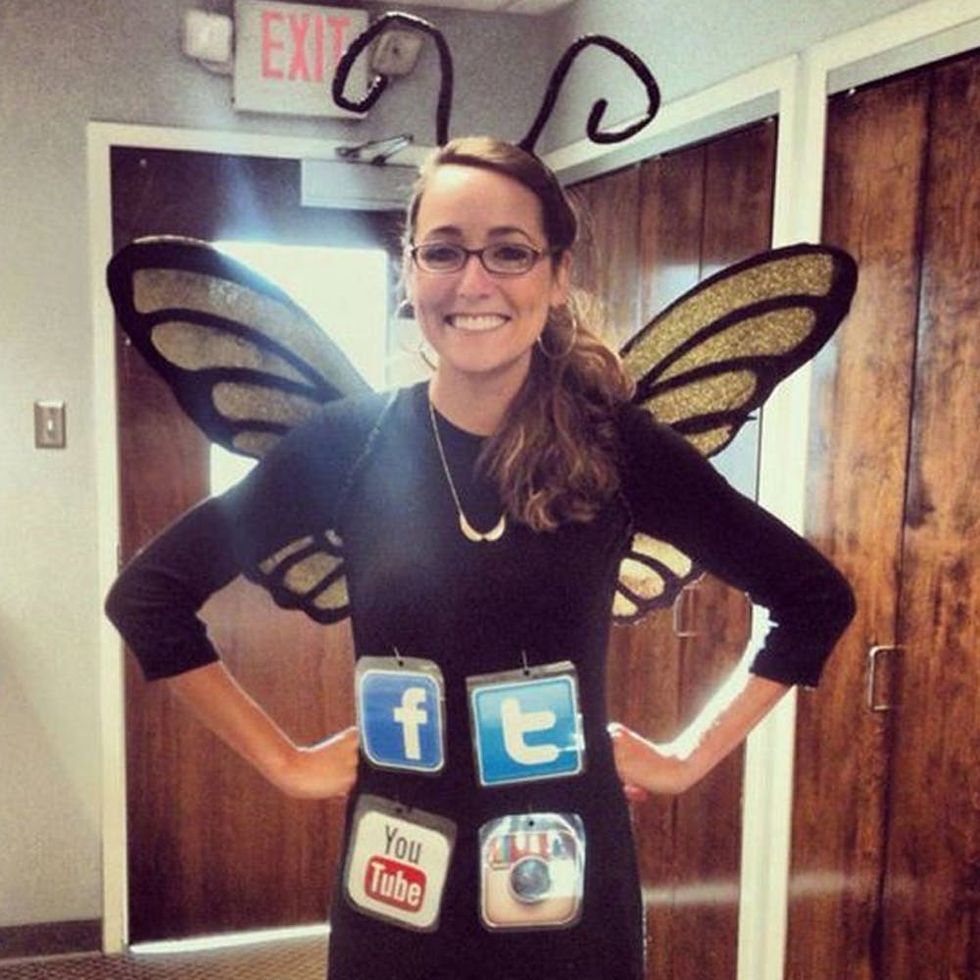 This next idea takes the term “social butterfly” to a whole new level. Simply print out the logo of a few social channels — i.e. Facebook, Instagram, Twitter, etc. — and iron them onto a black shirt. Create butterfly wings out of black and colorful felt and attach the wings to the backside of the shirt. On the other edge of the wing, attach a hair tie to slip onto your wrist. This will allow you to spread your wings and show all of your social loving colors.