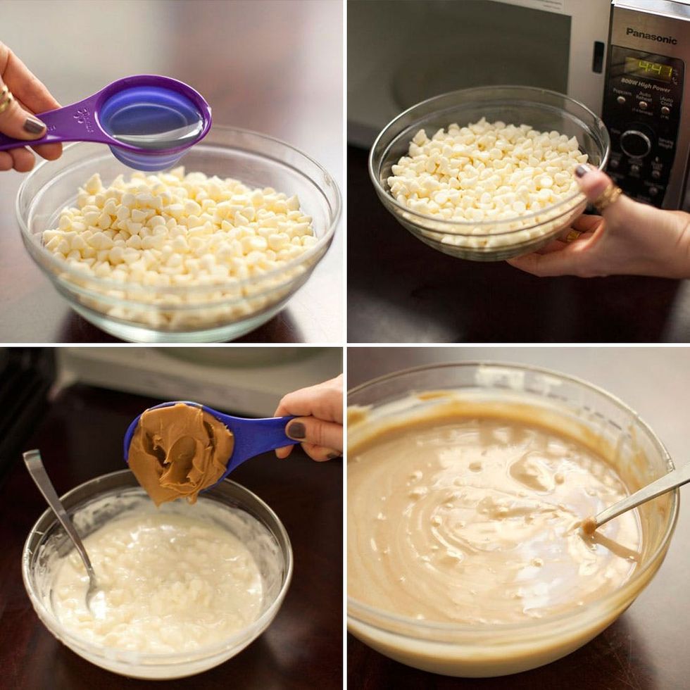 Let’s get started! Add the oil to the chocolate chips. Place the chocolate chips in the microwave for 90 seconds. Add the peanut butter, and microwave until completely melted.