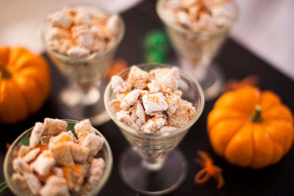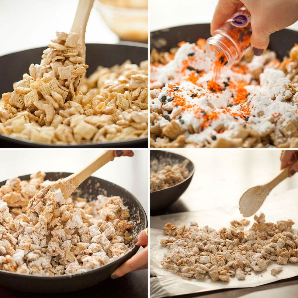 It’s not even October, but we’ve been pumpkin carving up a storm here at Brit HQ. If you’ve been busy trying out our pumpkin carving basics or high-tech pumpkins, you probably have some extra pumpkin seeds around the house. Lucky for you, we’ve got the perfect way to use them up! Introducing our Pumpkin Puppy Chow—the ultimate sweet treat for all of your fall festivities. Pumpkin pie spices, white chocolate, and colorful sprinkles add a Halloween twist to this classic snack recipe. Toss a few handfuls into some treat bags and you’ve got fun favors for a crowd!