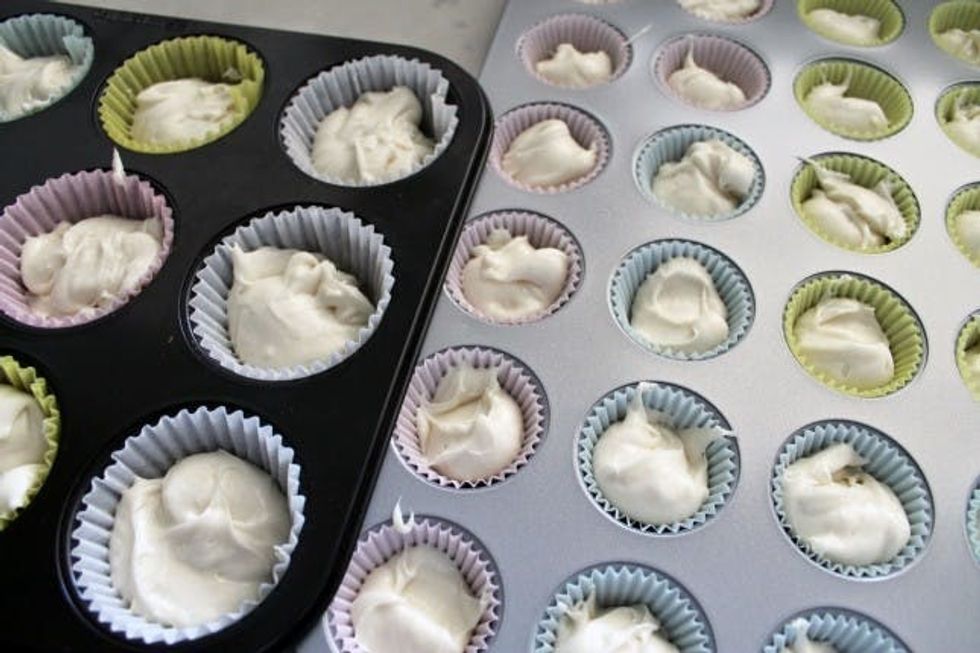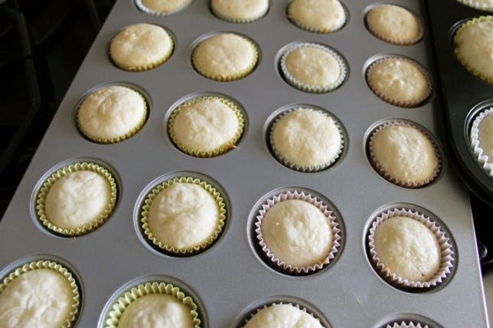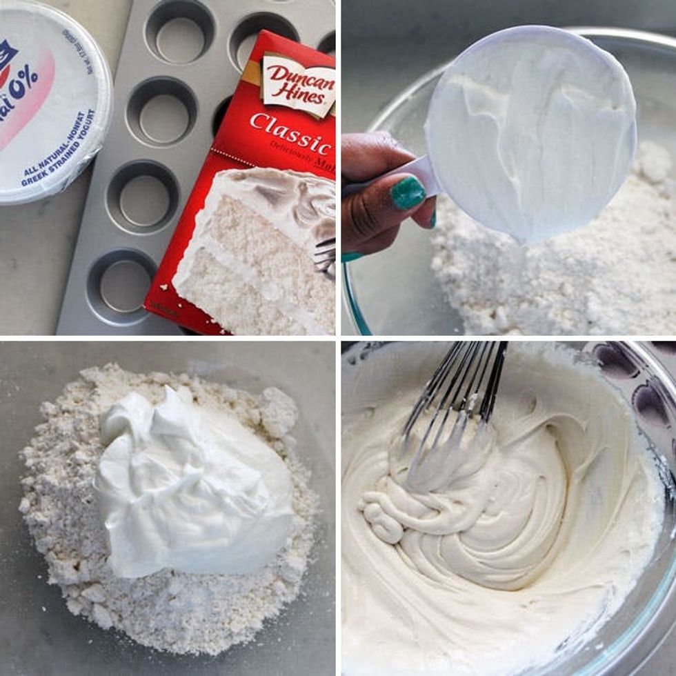Preheat the oven to 350 degrees F. For the cake part of the deal, we used Duncan Hines Fluffy White Cake Mix, a cup of water, and a cup of nonfat Greek yogurt in place of oil and eggs. Not only is this a “skinny” take on cupcakes, but it gives your cake a spongey, Angel food-like texture that is super tasty.