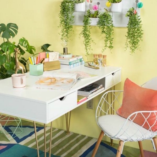 20. Preppy Workspace: Wondering what other colors work well with bright green? Let this workspace inspire you! Rosy pinks, bold blues and even shades of pastel look stunning with a zesty yellow-green wall. (via Oh Joy)