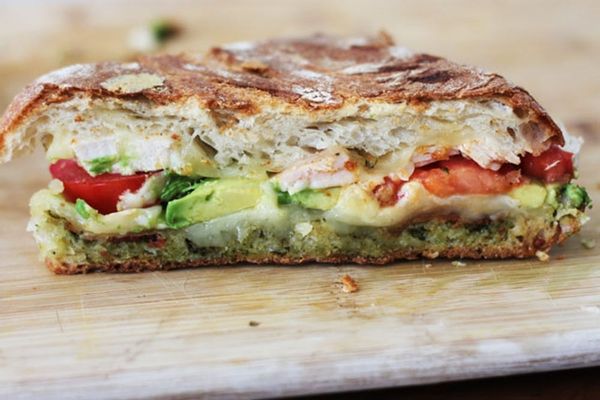 Turkey and Bacon Grilled Cheese with Tomatoes, Avocado, and Basil Pesto