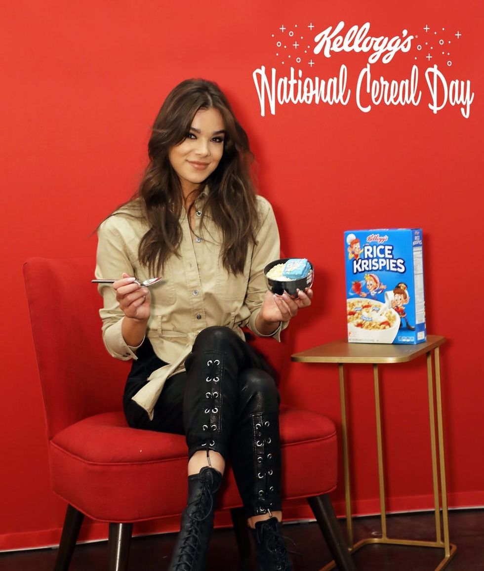 For Steinfeld, that includes celebrating the everyday little things that make her happy: like, say, cereal, for instance. In fact, when we speak to her, she’s actually at the Kellogg’s Café in NYC to help pay homage to one of her favorite foods with a live performance.