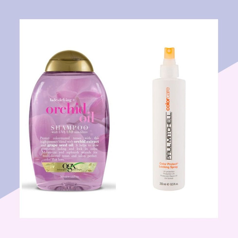 Mix up: OGX Fade-Defying + Orchid Oil Shampoo ($6) + Paul Mitchell Color Care Color Protect Locking Spray ($13)