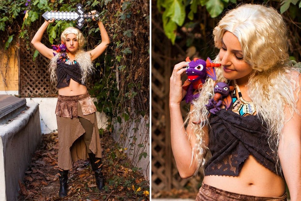 3. Daenerys Targaryen: If you watch Game of Thrones, you probably have a crush on Daenerys. This mother of dragons kicks some serious butt, leads armies, and looks ridiculously hot doing it. To recreate this look, we got a blond wig at a costume store and stocked up on earthy garments to create a warrior-like look. And, of course, you need dragons to complete the look! We took our scene to a nerdy level by throwing a minecraft sword into the mix as well.