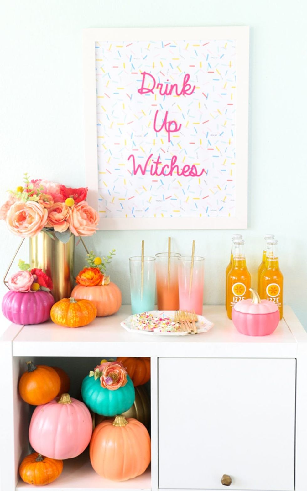 9. Colorful Witchy Bar: All those dark, moody colors aren’t for everyone. Cheeky art and pumpkin decor like this will do the trick. (via A Kailo Chic Life)