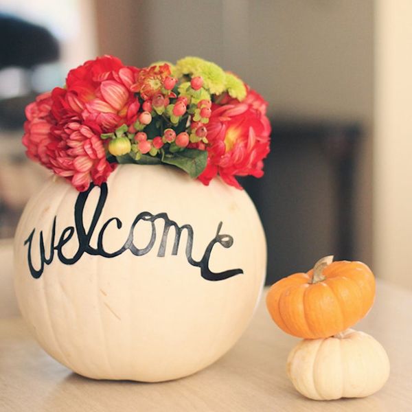 2. Welcome Sign: Skip the cheesy welcome signs this year and opt for a pumpkin vase instead. You could use it as a centerpiece or place it on your stoop. Either way, it will be cute + festive. (via BHG)