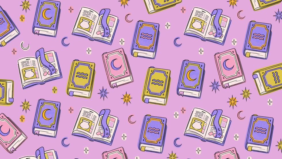 For the innovative Aquarius, a quirky, celestial wallpaper with spellbooks filled with potion recipes adds a touch of eccentricity to your desktop.