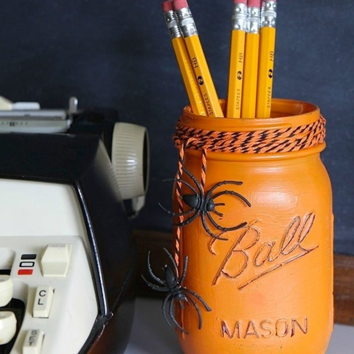 2. Halloween Desk Decor: Even the most conservative office has room for a new desk accessory like a snazzy pencil cup. All you need is a Mason jar, some paint and a few creepy crawlies from the dollar store. (via House of Hawthornes)