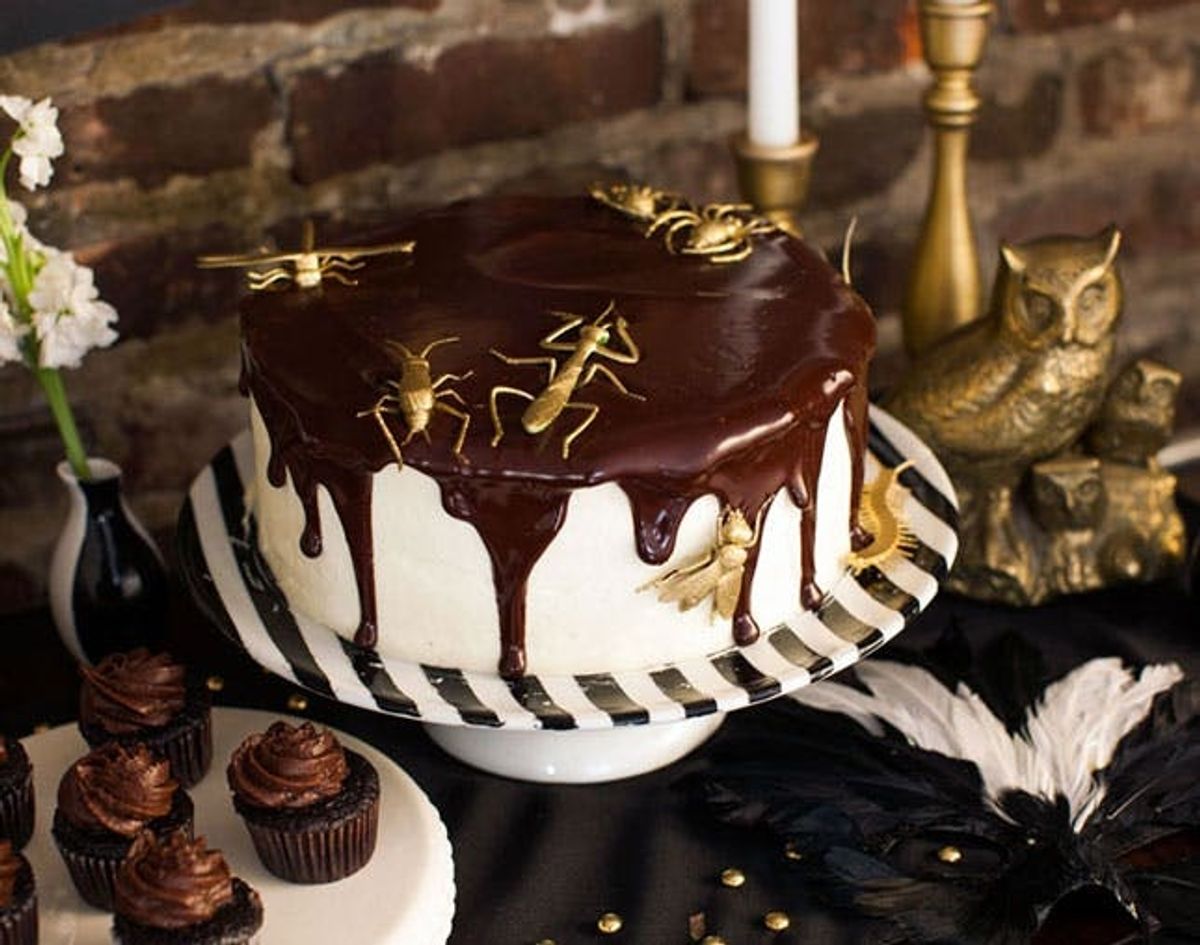 Black and White Striped Cake Stands, and Tuxedo Cake with Gilded Insects (bugs available here!).