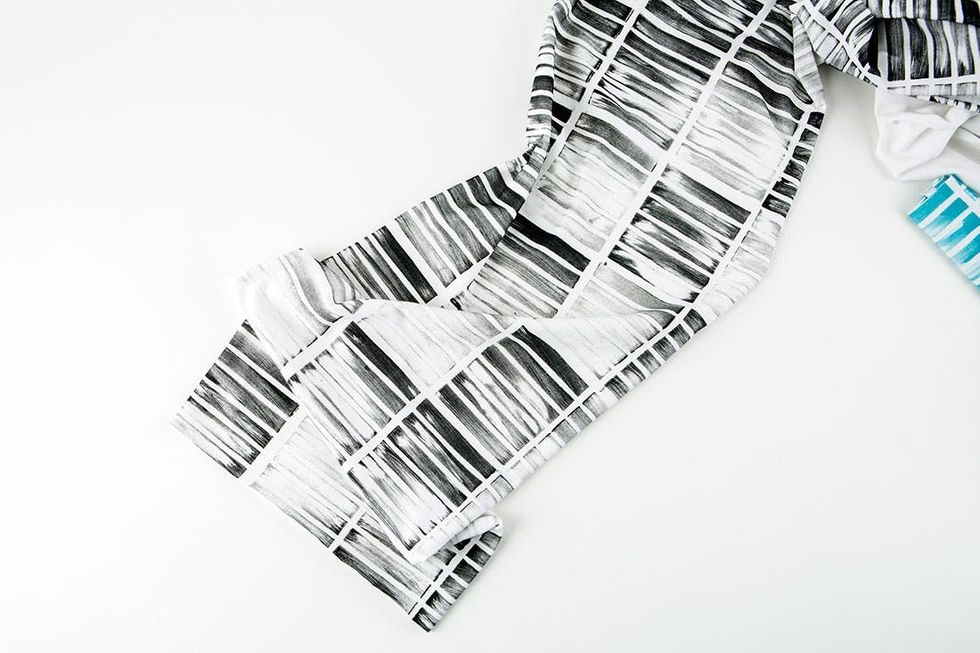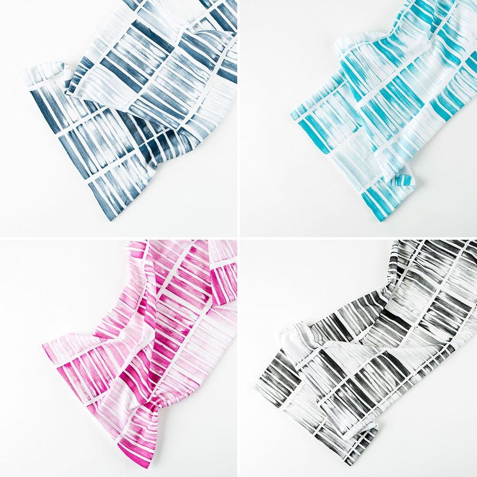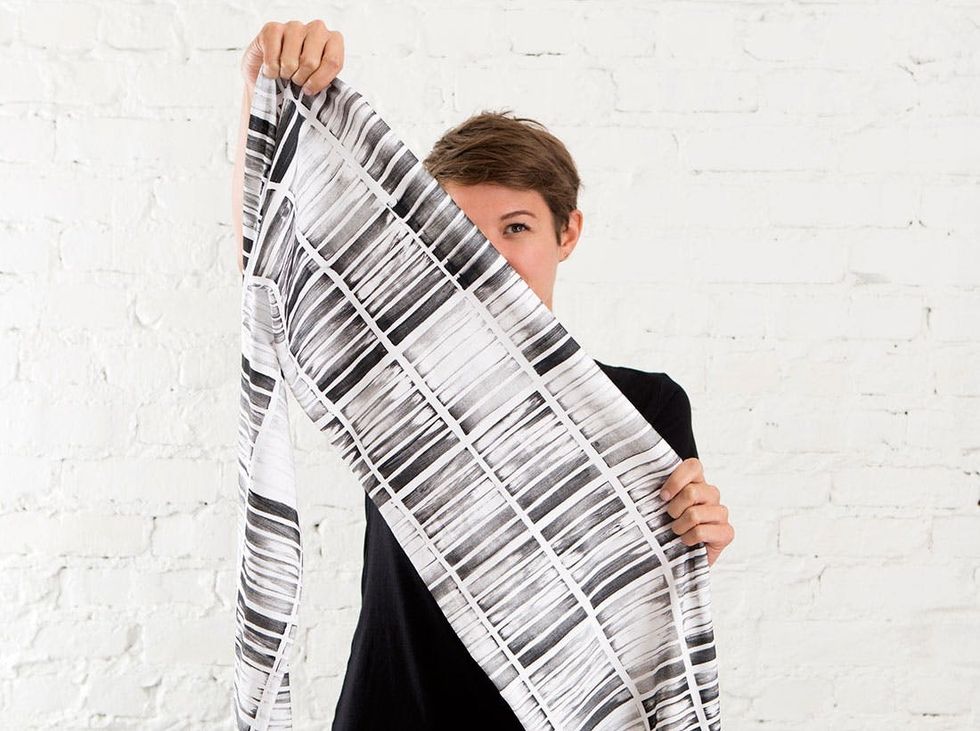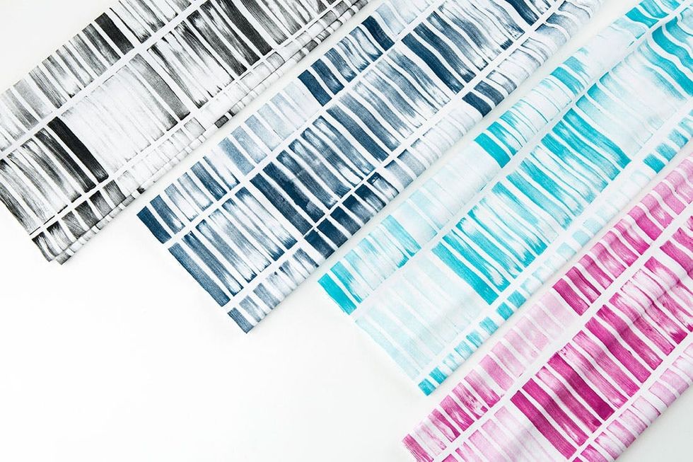 For the scarves, we tried out a slightly different technique, only loading up new paint every other section, giving the pattern a nice contrast. You can also play with a bit of a gradient, loading up more paint at the top of your stamp and less paint near the bottom.