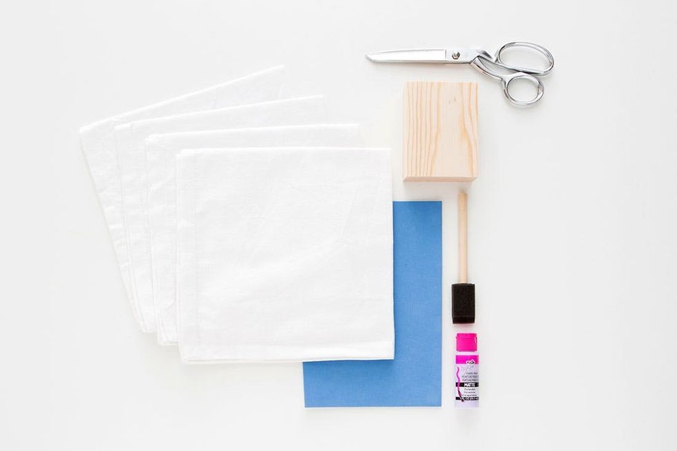 Press your stamp down firmly onto your napkins or scarf to transfer the fabric paint. Continue stamping until you have reached your desired effect. For the napkins, we loaded up the stamp with new paint for every section, for a consistent print.