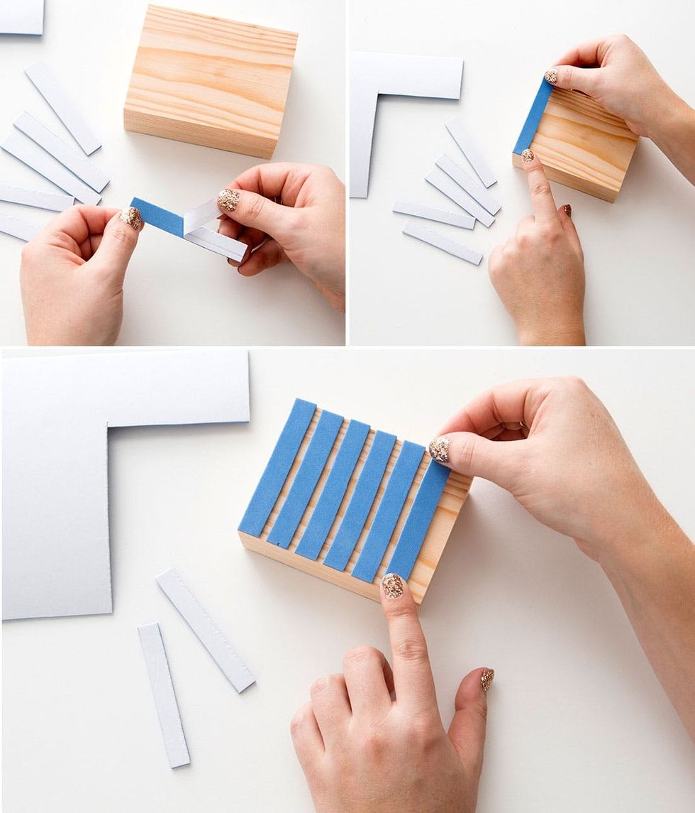3. Peel off the paper backing and stick foam shapes onto one side of the wood block.