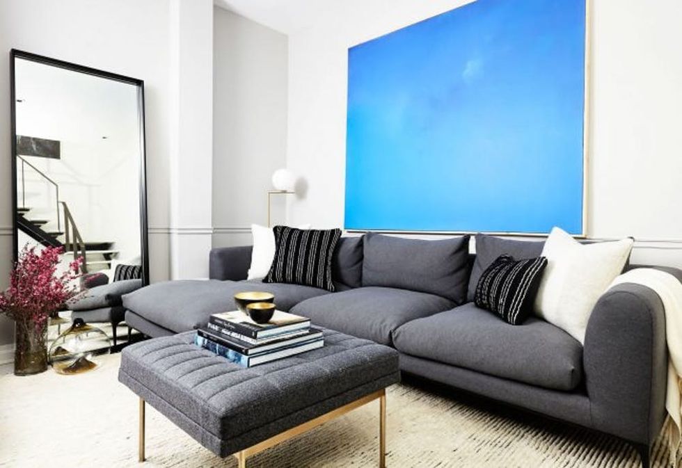 Make a similar statement in your living room by starting with a huge piece of blue artwork. Take a note from Bronfman and Fallis by steering clear of trendy color palettes in favor of neutral tones. Copy the rest of the subtle look with a comfy gray couch, black throw pillows, and a few glam, metallic accents, like a gold ottoman, brass lamp, and gilded bowls.