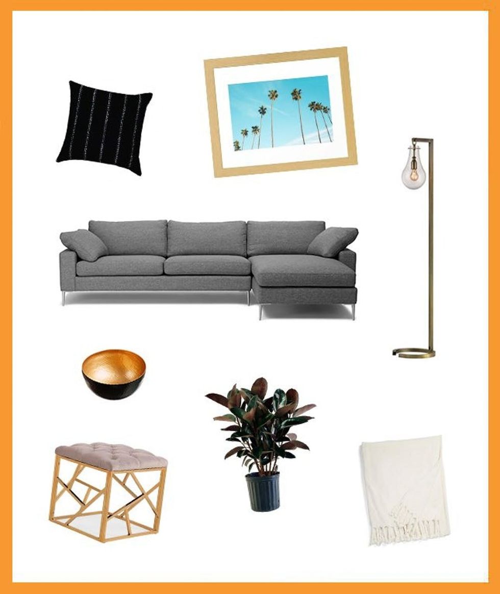 Premier Prints Carlo Black Pinstripe Polka Dot Pillow ($17+), Society Six Palm Tree Sunshine Art Print by Summer Dreams ($35+), Lulu & Georgia Poppy Floor Lamp ($358), Article Nova Gravel Gray Sectional Sofa ($4000), Kennebunk Home “Bliss” Plush Throw ($39), Delray Plants Burgundy Rubber Plant ($34), TOV Furniture Modern Skylar Grey Velvet Ottoman ($282), Just Slate Gold Serving Bowl ($40)