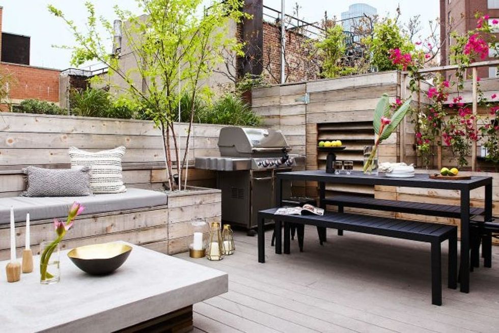 Transform your backyard or balcony with plush, gray throw pillows and warm, wooden accents. Then whip the space into majorly ‘grammable shape with gold lanterns, vases of fresh flowers, and trendy, black dining accessories.