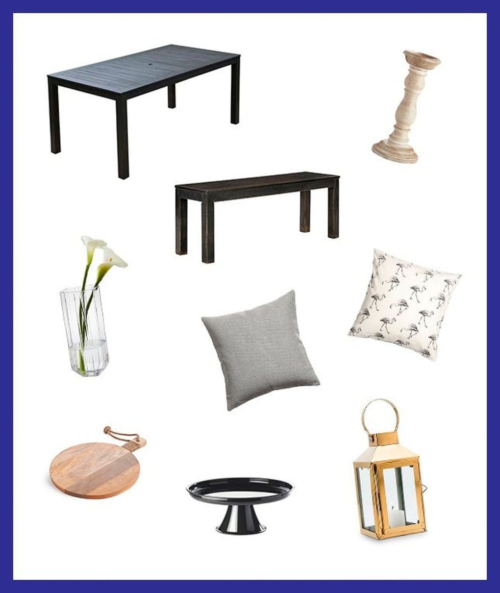 Willow Bay Patio Dining Table ($319), Signature Design by Ashley Gavelston Large Dining Room Bench ($130), Pier 1 Small Natural Wood Pillar Candleholders ($25), H&M Flamingo-Print Cushion Cover ($13), H&M Textured-Weave Cushion Cover ($13), Kenley Kreations Inc Decorative Candle Lantern ($12), Cal-Mil Cake Stand ($68), Urban Farm Round Mango Wood Cutting Board With Rope Accents ($20), CB2 Carlyle Glass Vase ($30)