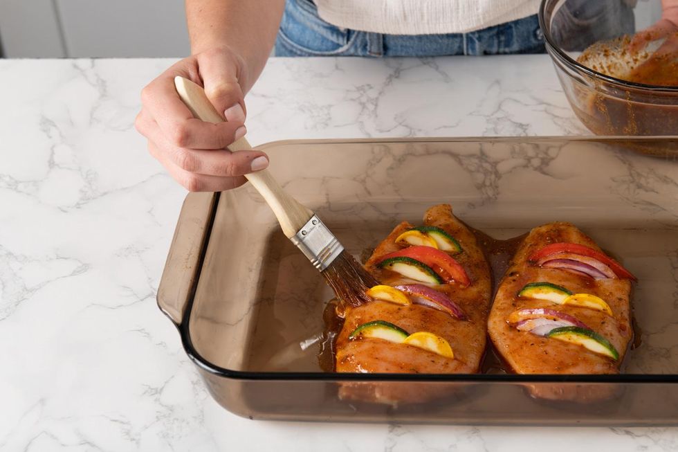 Coat chicken generously with the sweet and tangy glaze. Then bake at 350˚F for 20 minutes.