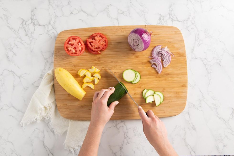 Slice veggies into half moon shapes to easily add to the chicken. Then make horizontal cuts across each PERDUE® PERFECT PORTIONS® BONELESS, SKINLESS CHICKEN BREAST and place in a small oven-safe dish.