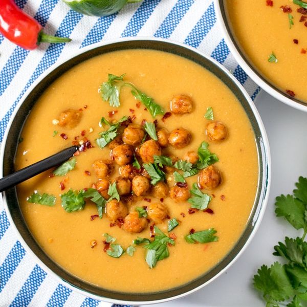 Chickpeas sound like a bit of an unusual base for a soup. On their own, they can be a little bland, but just look what happens when you whizz them up with a few special ingredients to make hummus? So delish! (BTW, we’re loving this Halloween Hummus and Veggie Platter right now). This soup has the hummus effect too. Cooked and blended together with sweet potato, chilis and lime, the flavor is amazing. It’s also “accidentally” vegan, making it a great lunch when you have any vegan buddies coming over! And a quick tip: Don’t throw away the liquid (called aquafaba) in your canned chickpeas. You can actually use it in recipes for amazing results (check out our aquafaba recipes).