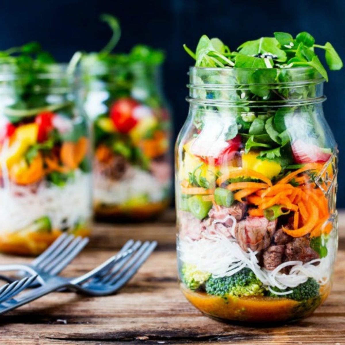 Thai Salad in a Jar: Layers of crisp veggies, leftover meat, slurp-worthy vermicelli noodles, and a punchy Thai salad dressing make this easy-to-transport jar salad the *only* salad you'll ever need. (Photo via Nicky Corbishly / Brit + Co)