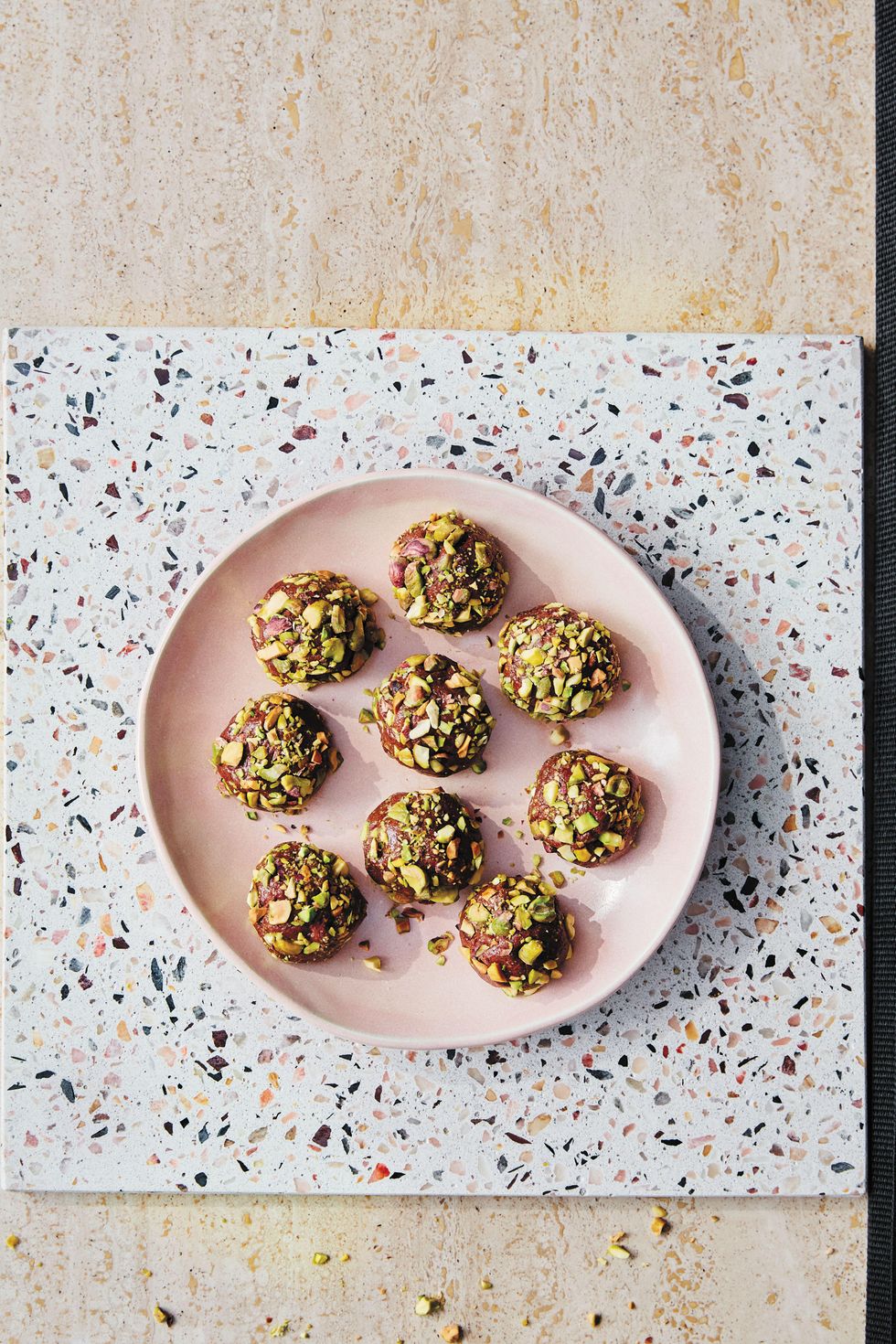 Scooping the mixture with a teaspoon, form into small balls. Roll in chopped pistachios and place in the freezer for about 30 minutes to firm up before serving.