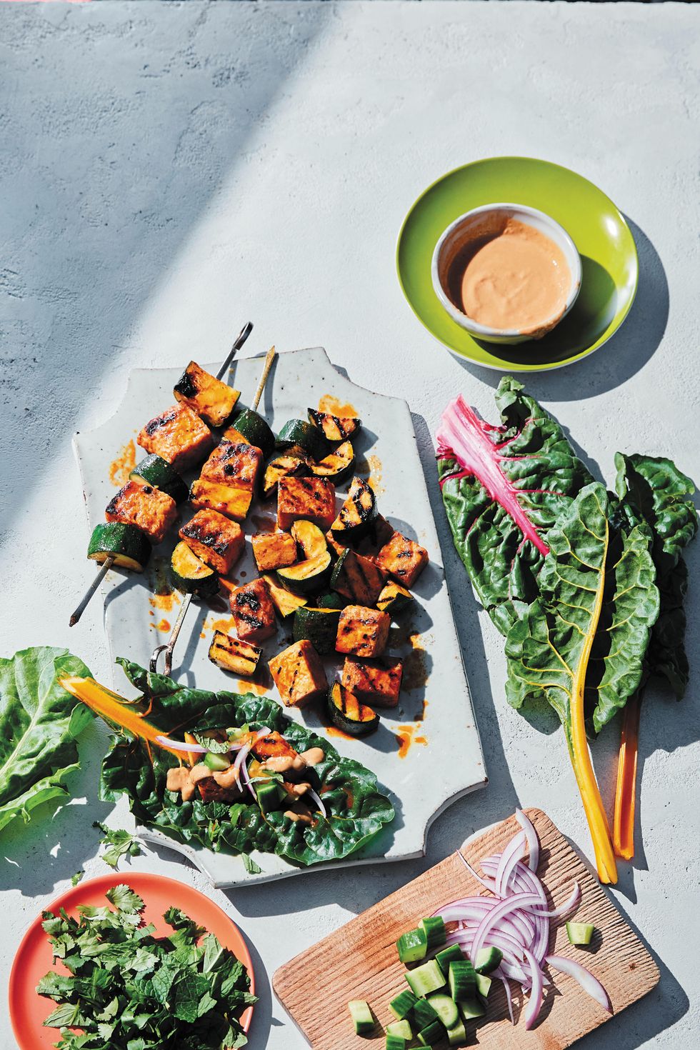 Remove the grilled tempeh and squash from the skewers and divide among the Swiss chard leaves. Top with the onion, cucumbers, and baby greens and drizzle with the sauce. Scatter mint and cilantro over the filling and roll up tightly. Cut each wrap in half and serve.