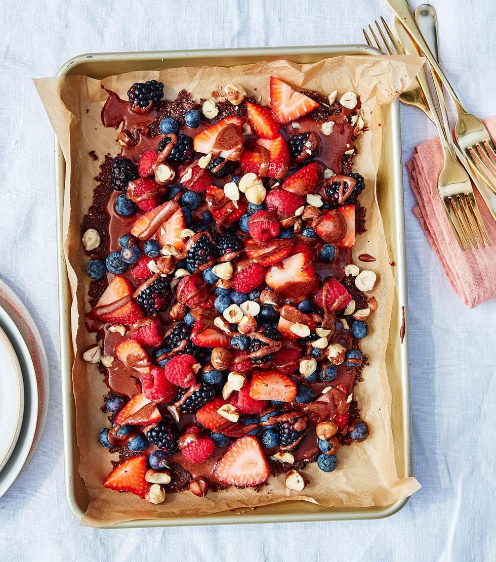 TO ARRANGE: Take the hazelnut crust out of the refrigerator or freezer and roughly spread 2 to 3 tablespoons of the coco-hazelnut butter over the crust (the goal is to make the fruit stick to the crust). Arrange the berries in any pattern you like. Drizzle 2 to 3 tablespoons of the butter on top of the fruit (you may need to warm it up slightly to make it drizzle at this point). Sprinkle crushed pistachios on top and place mint leaves around. Serve by slicing squares diagonally.
