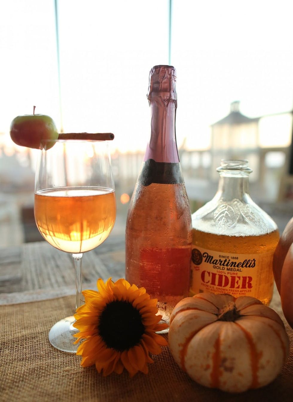 2. Add apple cider and a dash of cinnamon on top. Garnish with a cinnamon stick and crab apple. Cheers!