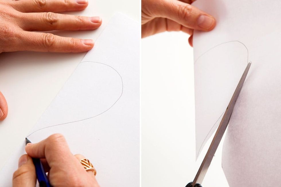 The first order of business is making a pattern. The easiest way to cut out a perfect heart is to fold your paper in half, draw half a heart along the seam, and then cut out your shape. When you unfold it, you’ll have yourself a heart.
