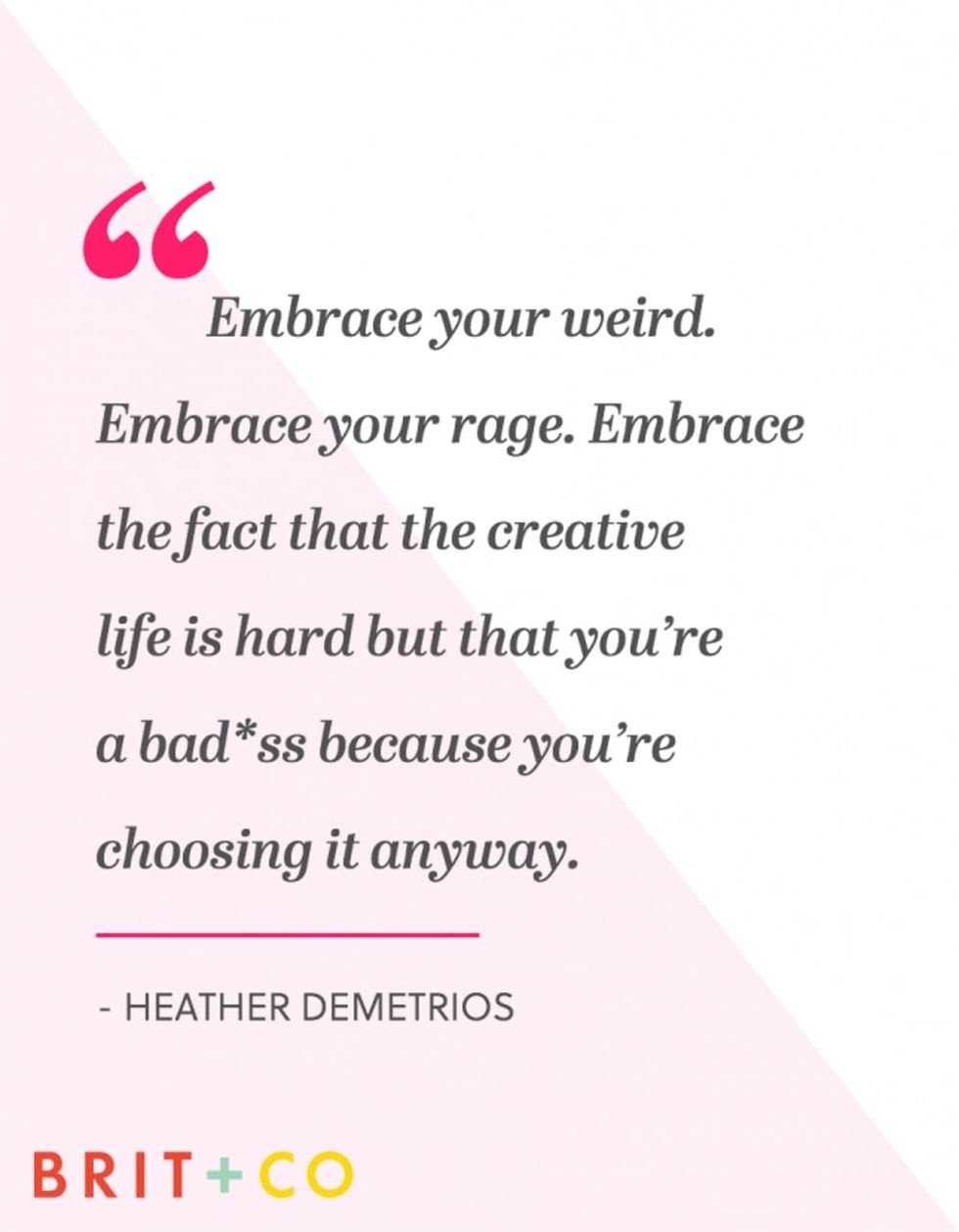 Focus on your voice, your vision, and what you — unique, beautiful, wonderful you — have that no one else does and bring that to the table. Embrace your weird. Embrace your rage. Embrace the fact that the creative life is hard but that you’re a badass because you’re choosing it anyway. Not everyone will get you or love you or choose you, and that’s okay. Remember: When it comes to getting your creative work out there, you just need one yes. It doesn’t matter how many no’s came before it (just ask my girl Virginia Hall). But also? You will always be your own best advocate. Nobody, I mean nobody, will care about or fight for you and your work as much as you will. So it’s time to put your big girl panties on and get ready.