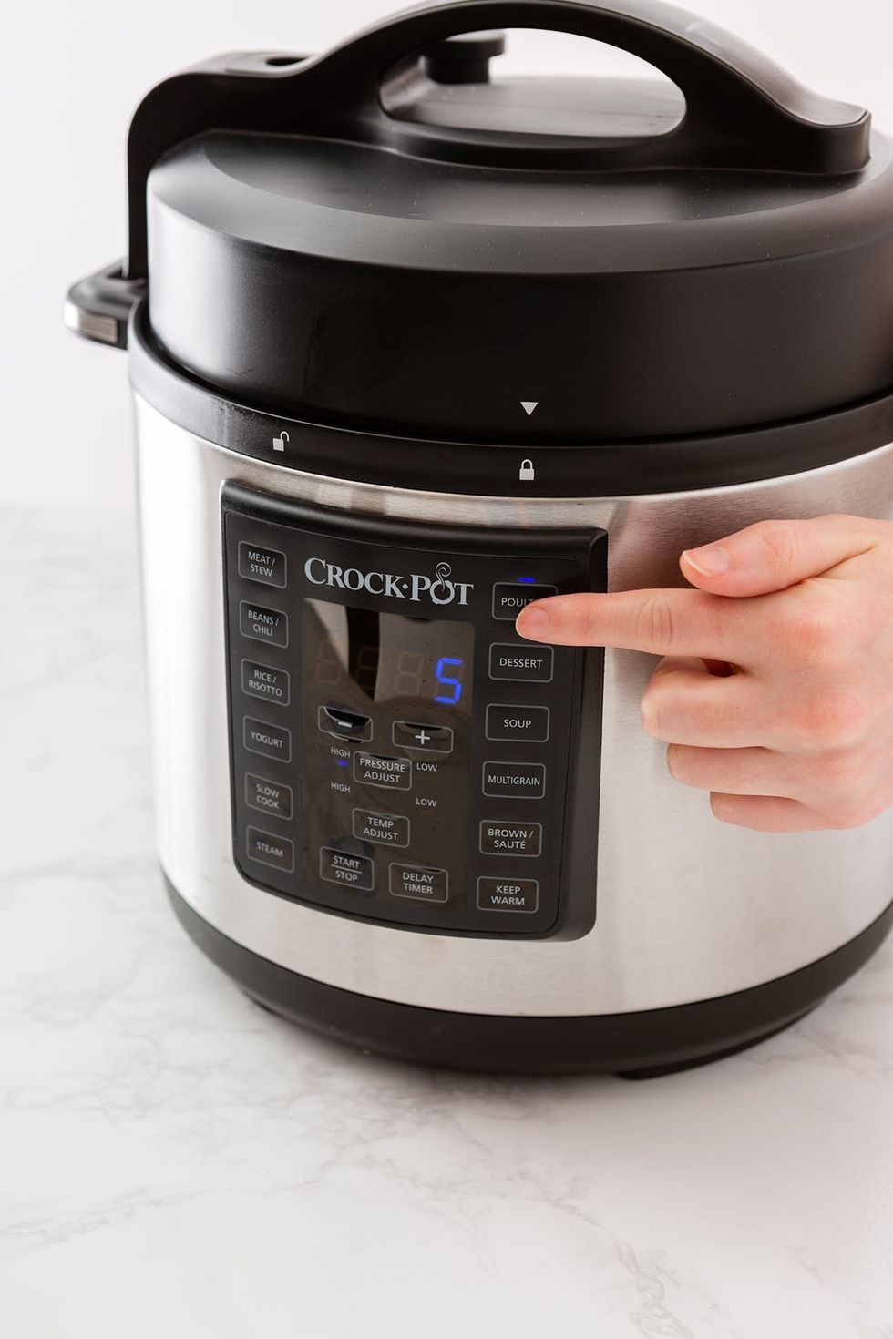 Close lid securely into the lock position. Make sure the vent is also in the closed position. Pressure cook on low for 8-10 minutes or using the poultry setting. Quick release.